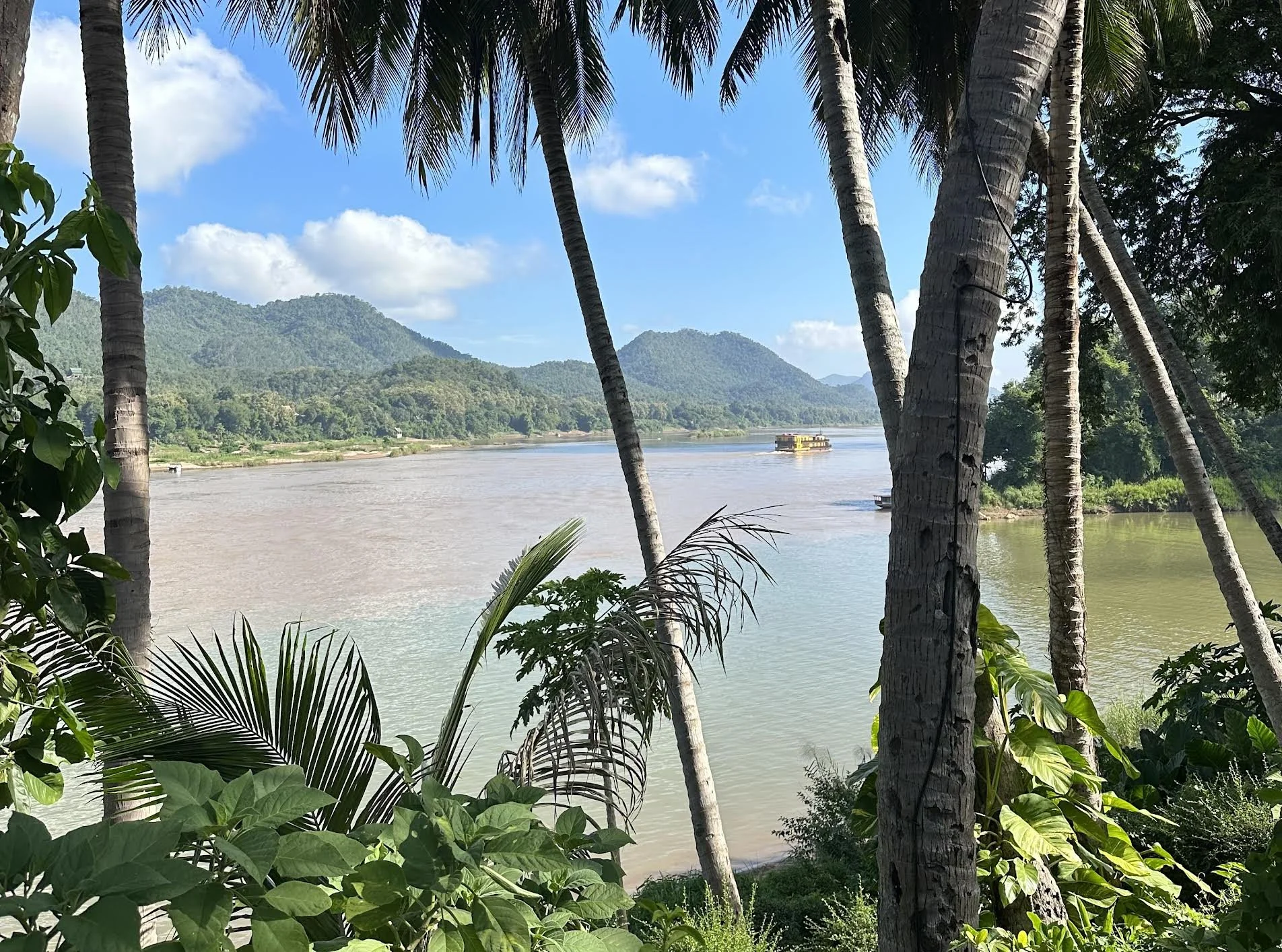 Clouds float over the ruddy-colored Mekong as the waters of the green Nam Khan flow in and mingle. Dok Champa (the Lao name for Frangipani) scents the air at this spiritual juncture of two rivers.